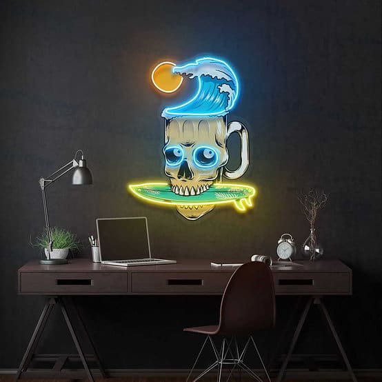 Surf-Inspired Design: The “Beach Skull” LED / UV Print Neon Sign showcases a surf-inspired design that brings the beach to your space. It’s a stylish piece that captures the essence of coastal living.